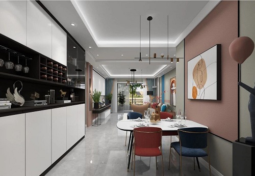 生活是一日三餐與四季,也是家人在一起的歡聲笑語。開放式餐廳搭配低飽和度的粉色墻面背景,將文學中的至真情愫印刻得生動具體。