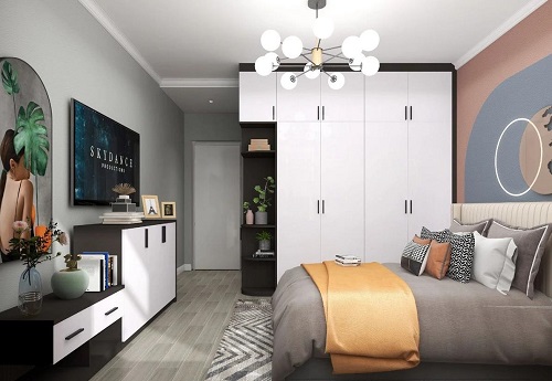 主臥采用藍灰色和粉色,搭配活力橙的床品撞色設計,讓整個空間有了質的飛躍,米白色的床頭,高級灰的被子,優雅的掛畫,無異于讓整個空間時尚與復古并存。