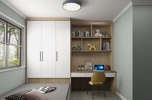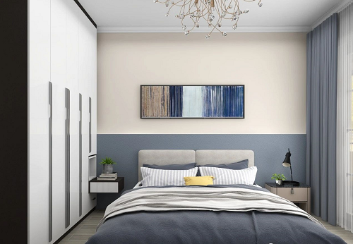 次臥則更加簡潔一些,絕美的灰藍,是僅次于高級灰的裝飾色彩,既有著灰色的溫柔高雅,也有藍色的沉靜內斂,簡單的設計,溫馨且舒適。
